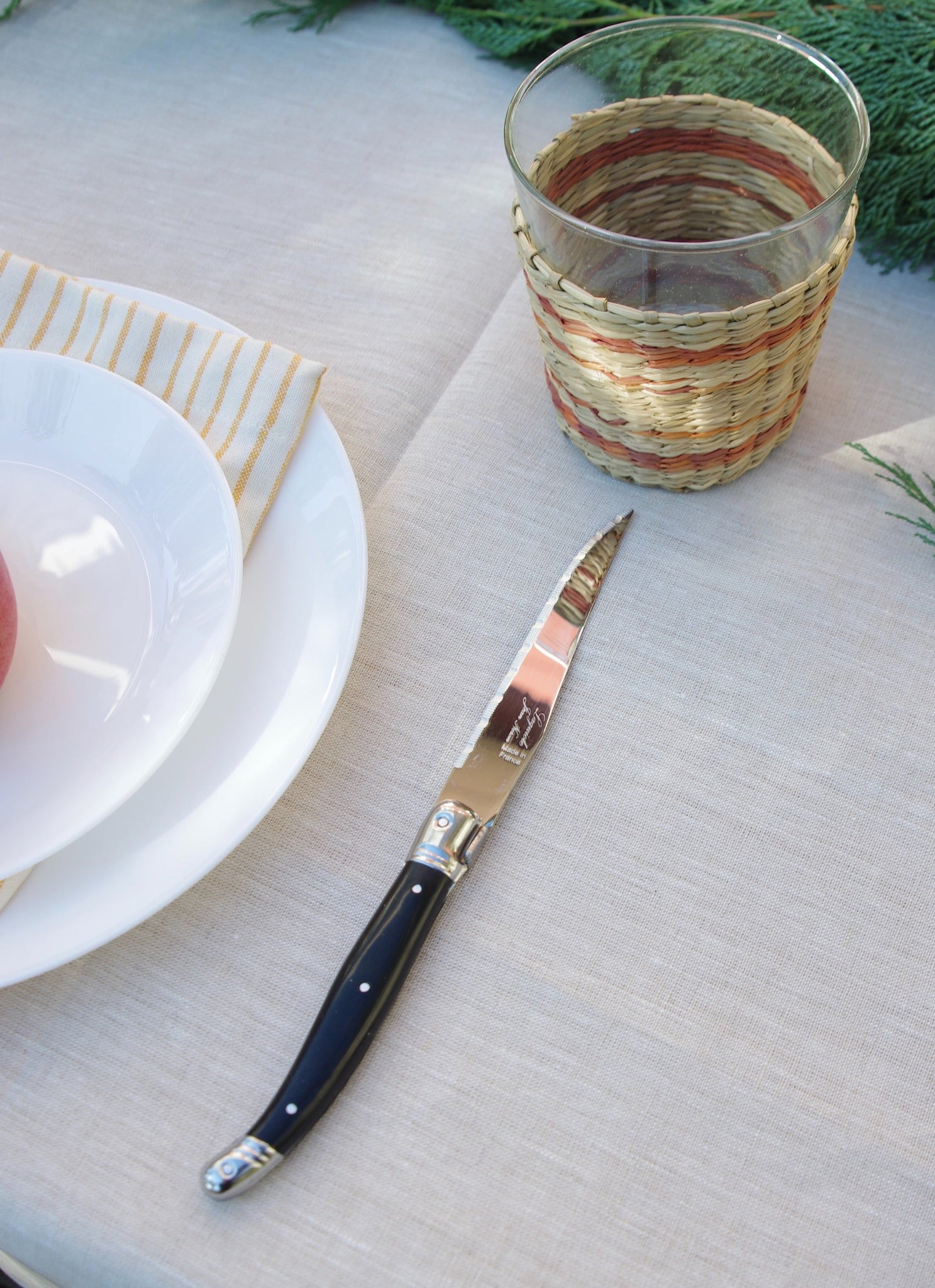 We are launching two new designs in our Seagrass line – a rich brown color inspired by a classic 1920’s French pattern, and a white stripe line inspired from typical table linens from the southwest of France. This solid weave edition is an exclusive to our traditional retailers.